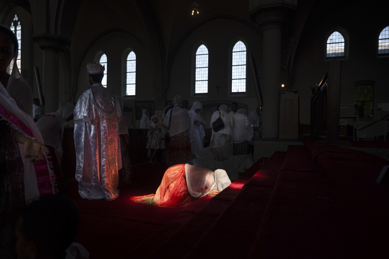Wereldkerken in Nederland (serie): biddende vrouw in de Ethiopisch-orthodoxe Tewahdo Kerk Tsereha Aryam, Veldhoven