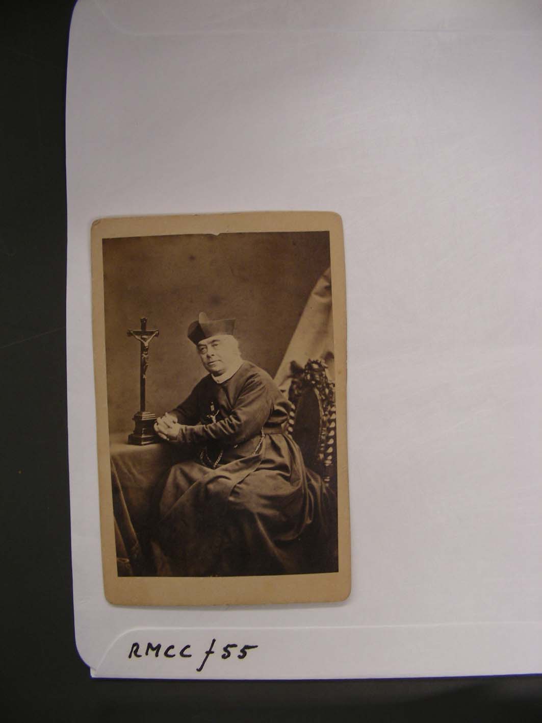 Portret van pater Bernard, op een stoel aan een tafel, waarop een kruisbeeld