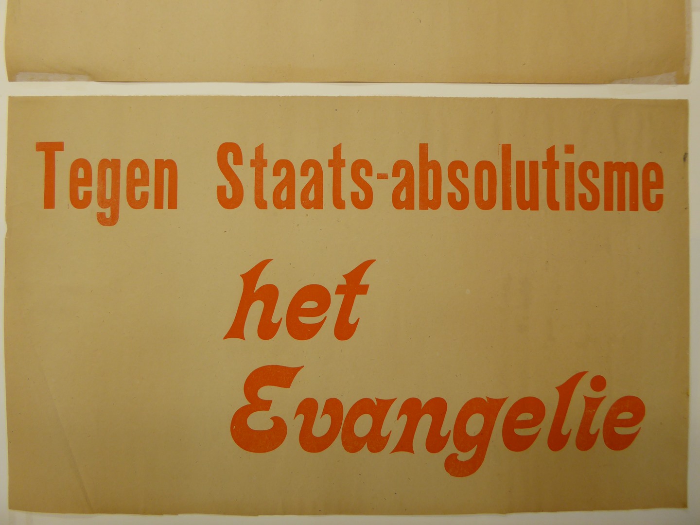Affiche of raampamflet met tekst in oranje "Tegen Staats-absolutisme het Evangelie"