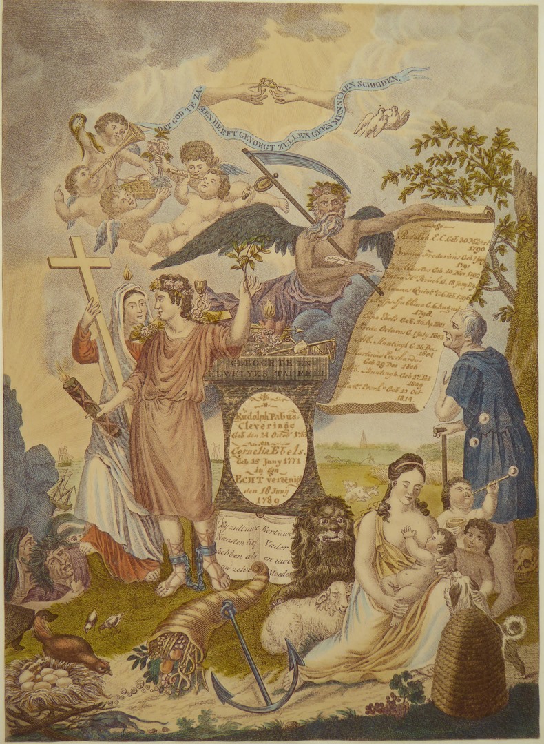 Geboorte en huwelijks tafereel van R.P. Cleveringe en C. Ebels, 12 kinderen en symbolen