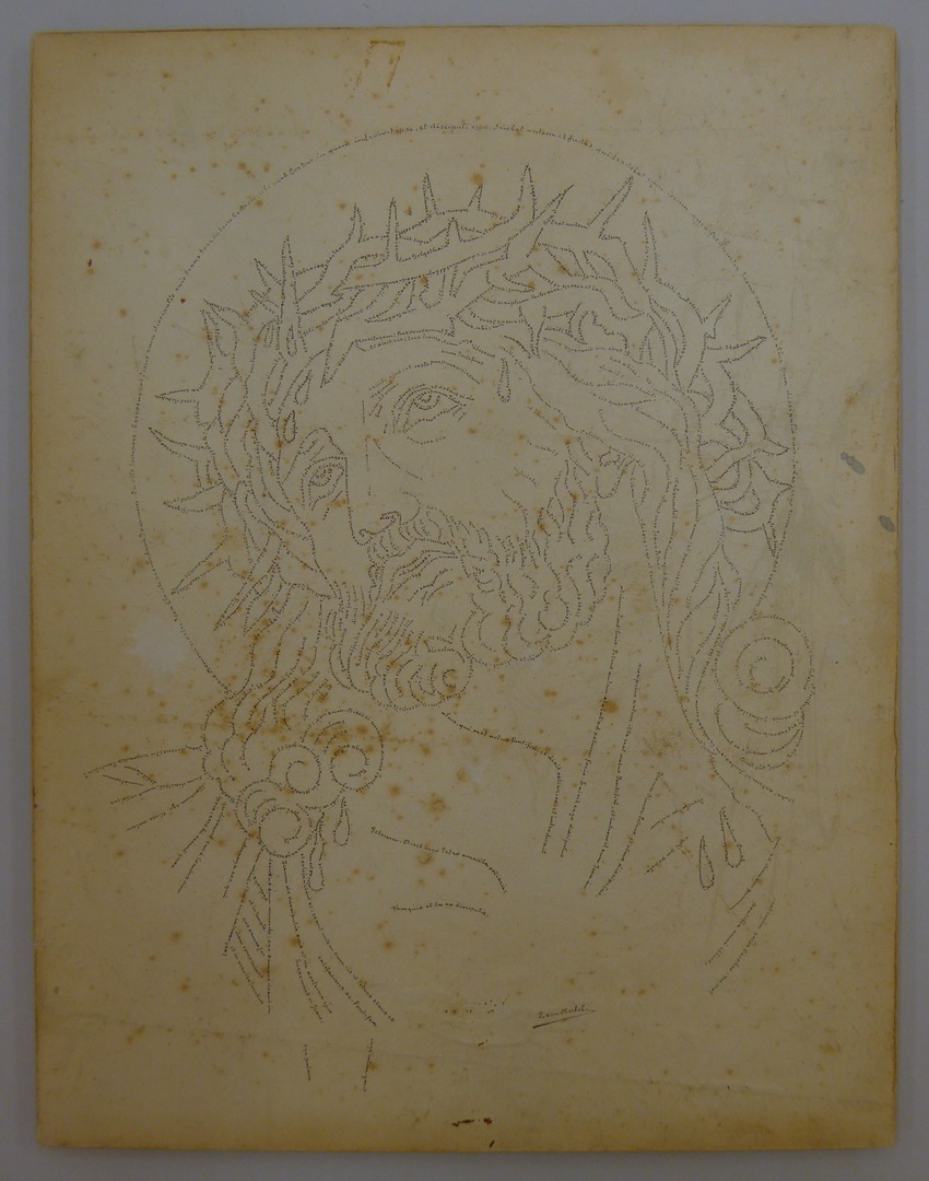 Christus met de doornenkroon afgebeeld d.m.v. tekstjes uit het Passie-verhaal