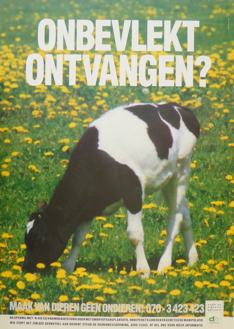 Affiche van de dierenbescherming, kalf in weide met "Onbevlekt ontvangen?"