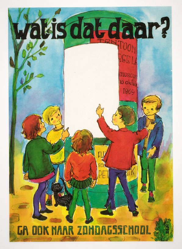 Affiche "Wat is dat daar? Ga ook naar zondagsschool", met reklamezuil en vijf kinderen