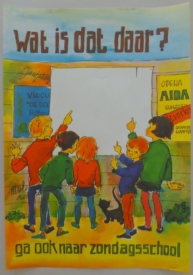 Affiche "Wat is dat daar? Ga ook naar zondagsschool", met schutting en vijf kinderen