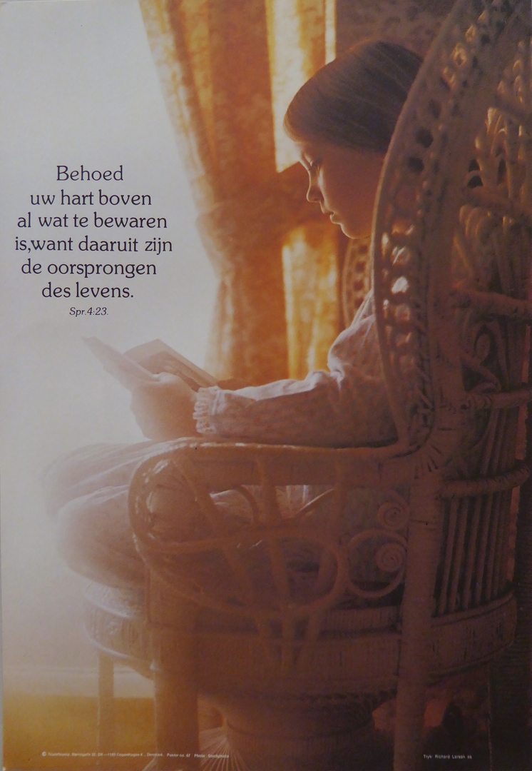 Affiche "Behoed uw hart boven al wat te bewaren is, want ...", met meisje lezend in stoel