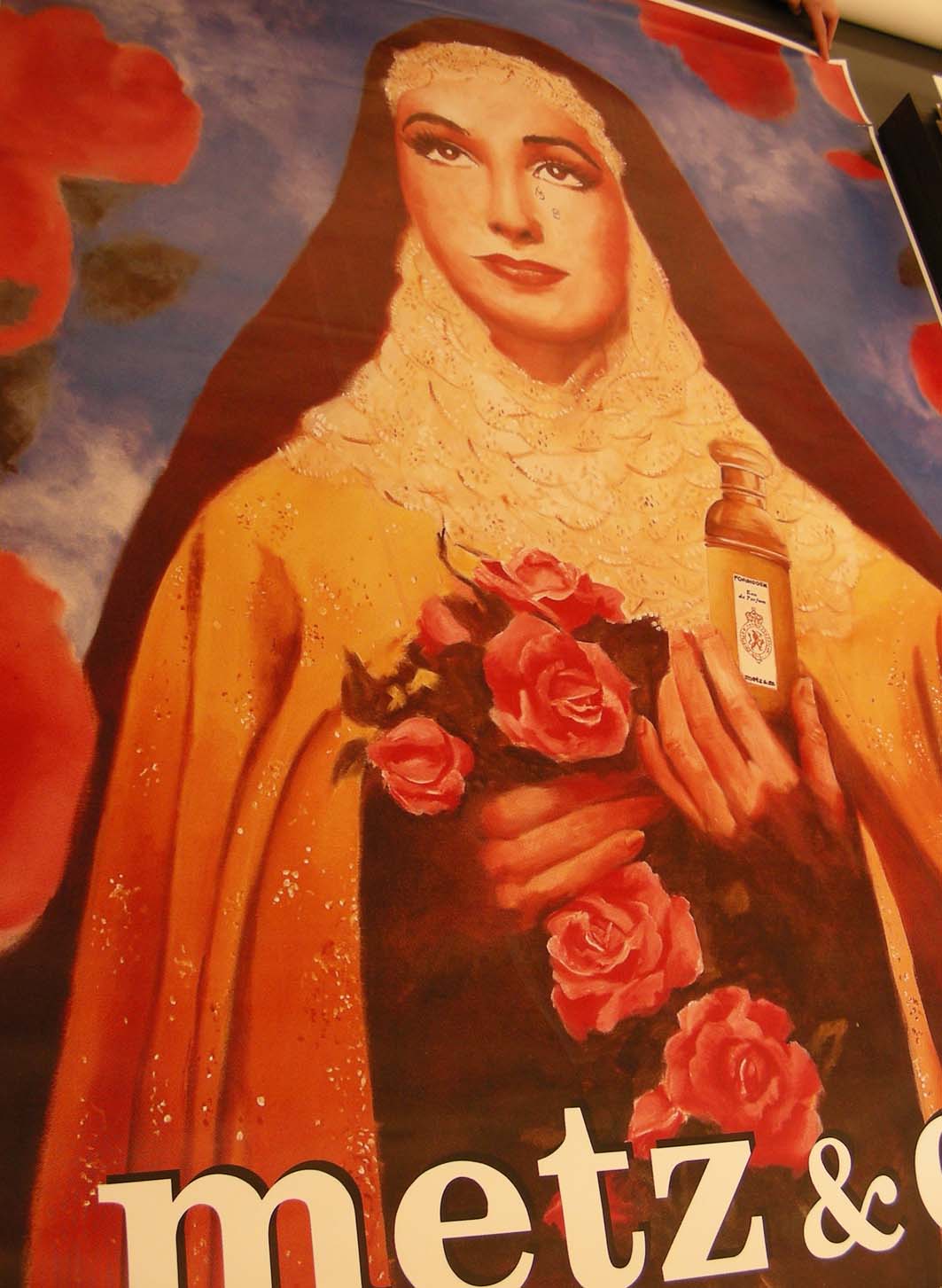 Affiche met H. Theresia met flesje eau de parfum Forbidden, met "Metz & Co the wonder of christmas"