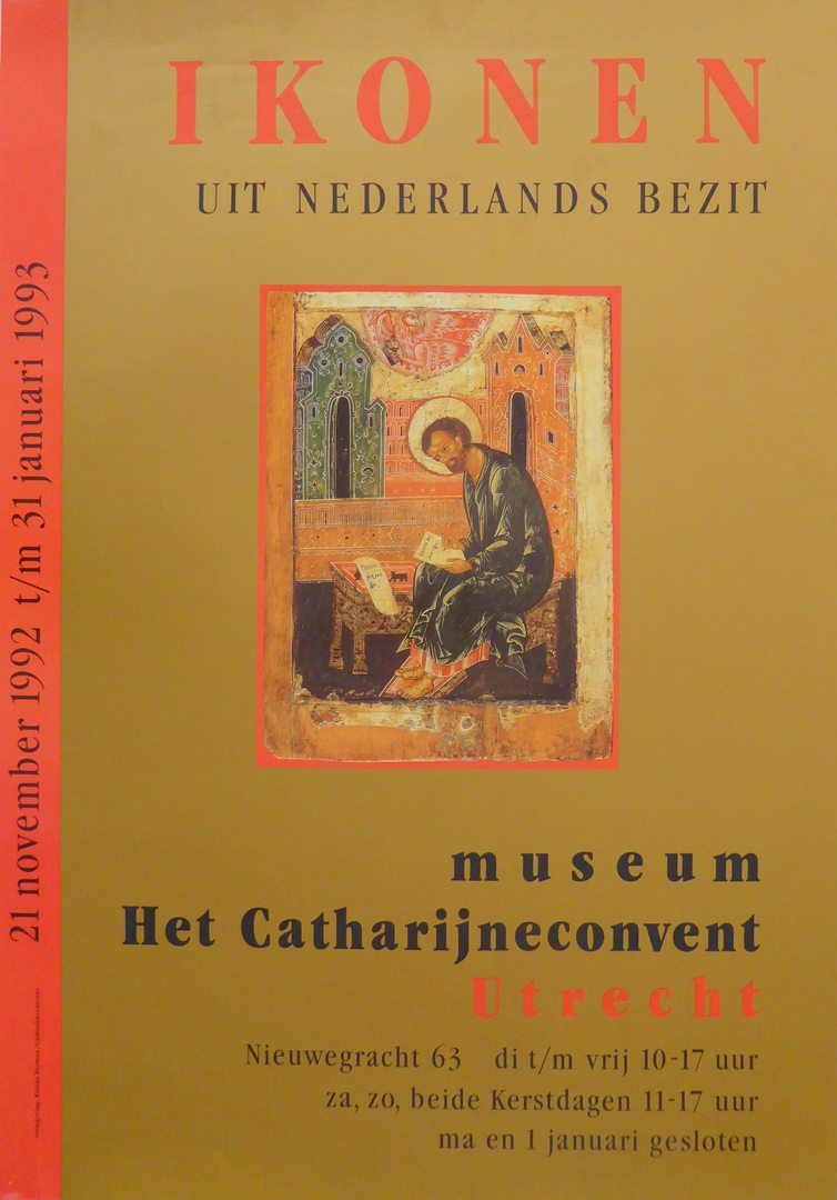 Goudkleurig affiche met "Ikonen uit Nederlands bezit museum Het Catharijneconvent Utrecht"