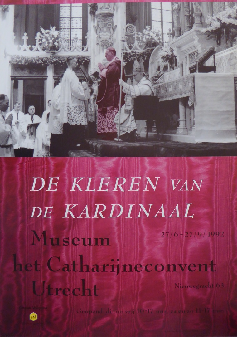 Rood affiche met "De kleren van de kardinaal Museum het Catharijneconvent Utrecht"