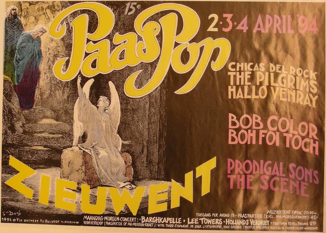 Affiche "15e Paaspop Zieuwent" met namen van optredende groepen, met engel uit Doré-bijbel