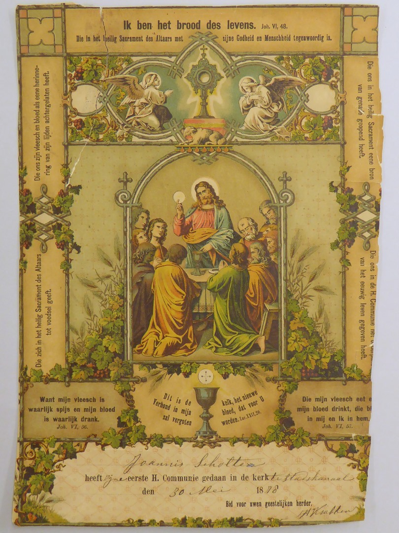 Communieprent van Joannis Scholte, 30 mei 1878 te Stadskanaal, met laatste avondmaal en bijbelverzen