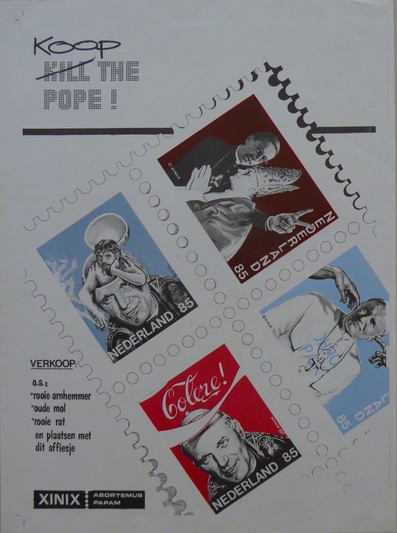 Affiche met "Kill (doorgehaald) koop the pope!" met vier afbeeldingen van postzegels met paus
