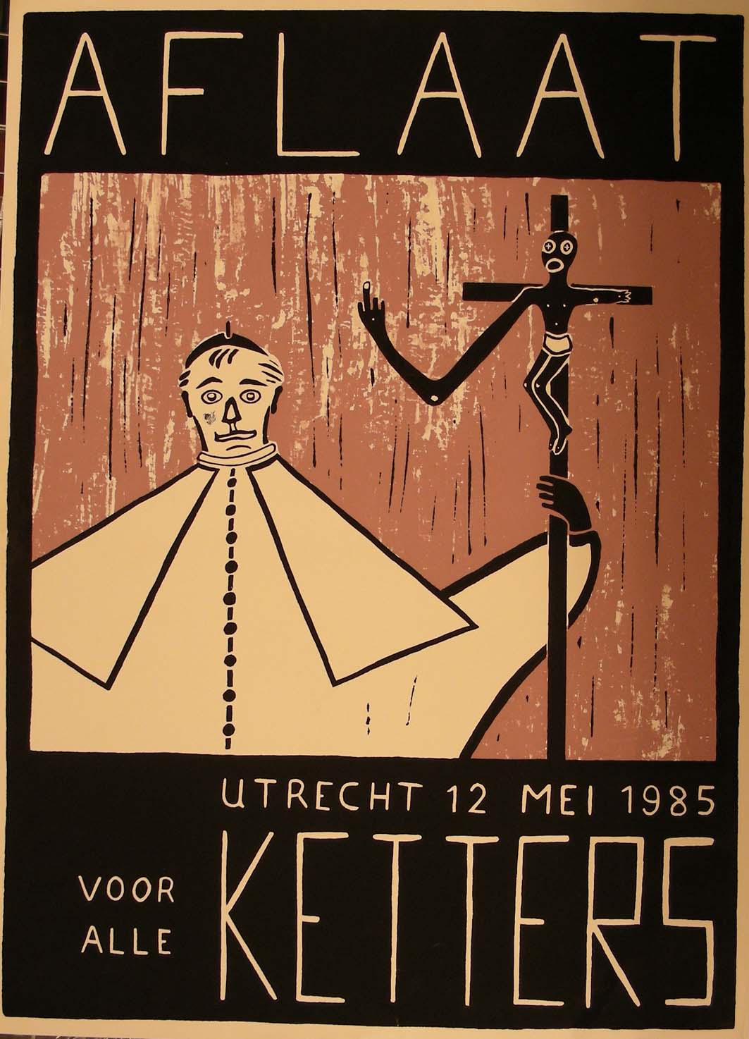 Affiche met "Aflaat voor alle ketters Utrecht 12 mei 1985", met tekening paus met kruisbeeld