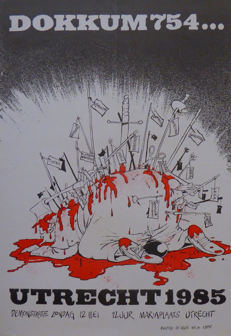 Affiche met "Dokkum 754 ... Utrecht 1985 ..." met bloedende paus geveld door wapens van tegenstanders