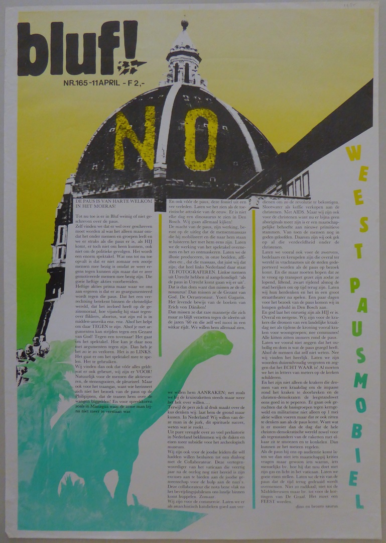 Affiche met "Bluf! ... De paus is van harte welkom in het moeras ...." met tekst en dinosaurus