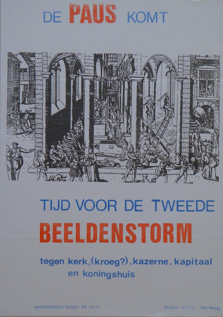 Affiche met "De paus komt Tijd voor de tweede beeldenstorm tegen kerk, (kroeg?) ..."
