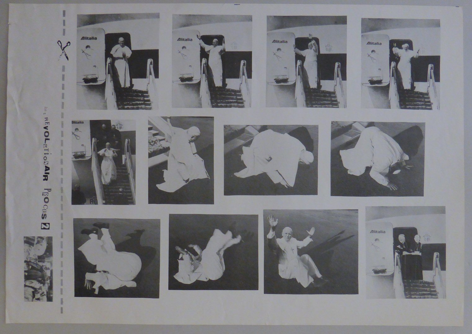 Affiche met beeldverhaal waarin paus vliegtuig uit komt en koppeltje duikelt, achterzijde tekst