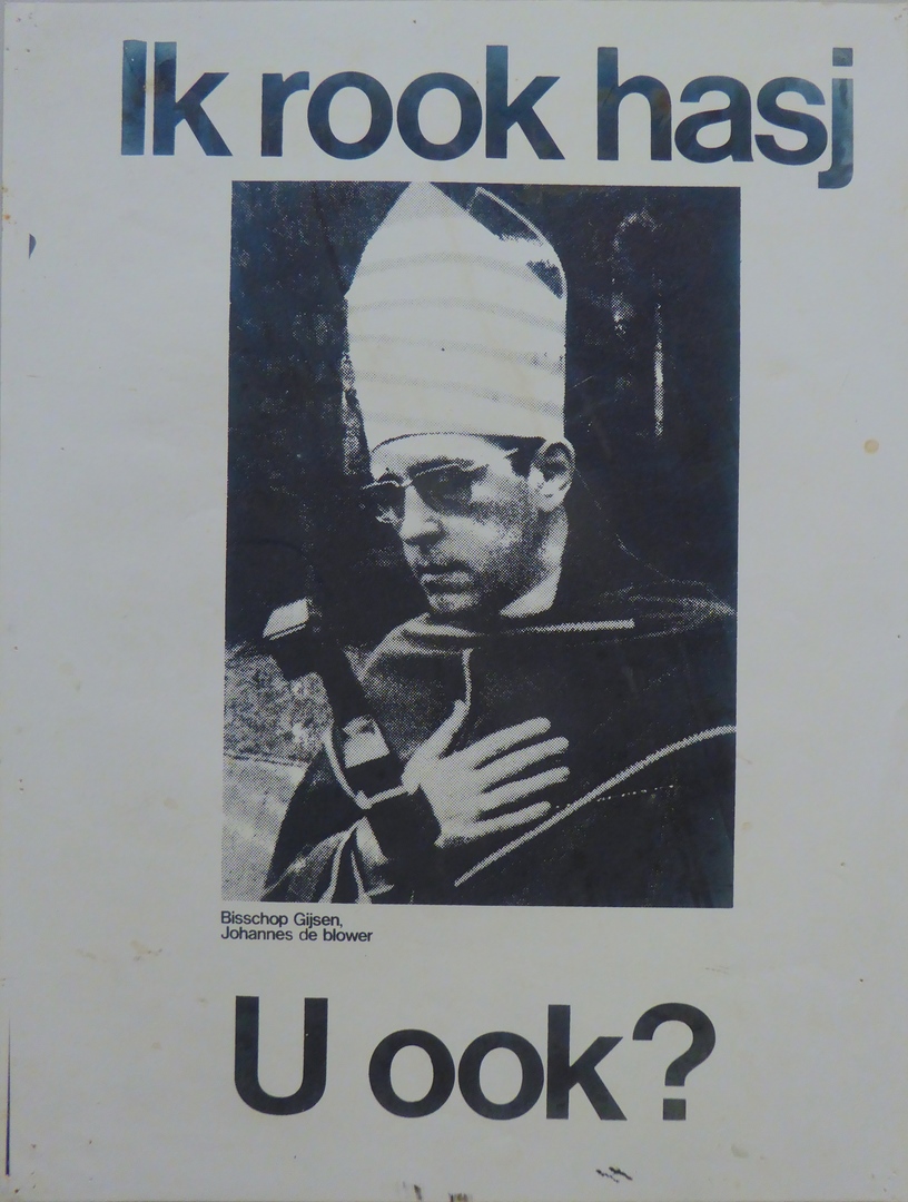 Affiche met "Ik rook hasj U ook?" met portret met "Bisschop Gijssen, Johannes de blower"