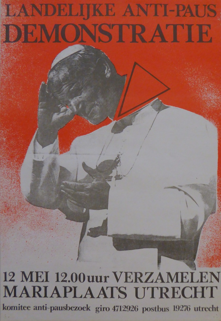 Affiche met "Landelijke anti-paus demonstratie" met paus Johannes Paulus II