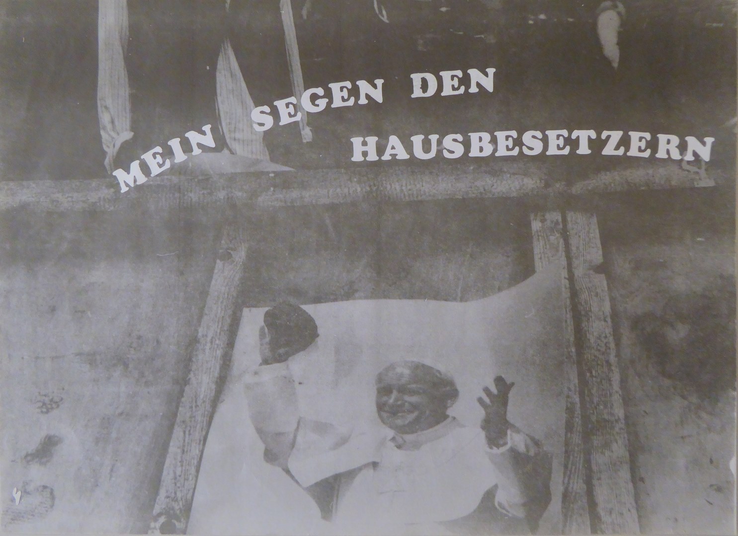 Affiche met "Mein segen den Hausbesetzern" met afbeelding paus Johannes Paulus II