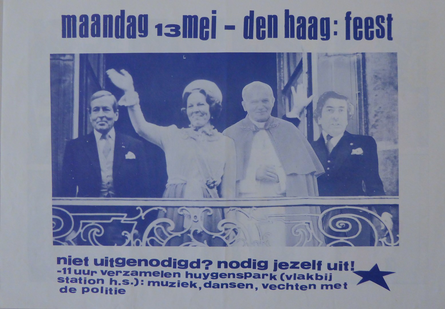 Affiche met "Maandag 13 mei - den haag: feest" met paus Johannes Paulus II, Beatrix, e.a.