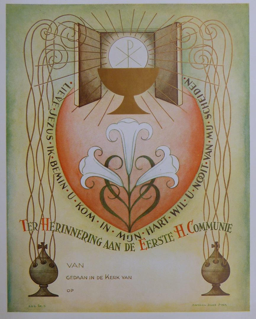 Communieprent met wierookvaten, lelies, kelk met hostie, met "Lieve Jezus ... van mij scheiden"