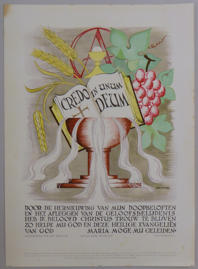 Plechtige-communieprent met doopvont, waterstromen, korenaren, druiventros, kelk, hostie