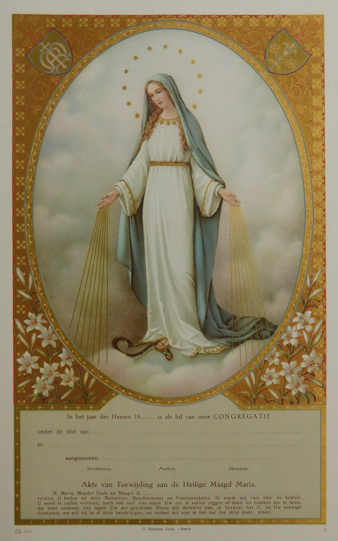 Akte van toewijding aan Maria Onbevlekt Ontvangen, met Maria staande op slang, met lelies