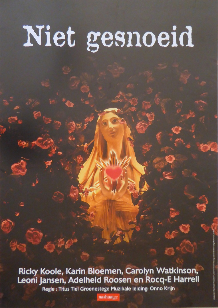 Affiche theatervoorstelling "Niet gesnoeid" met Mariabeeld met H. Hart omringd door rozen