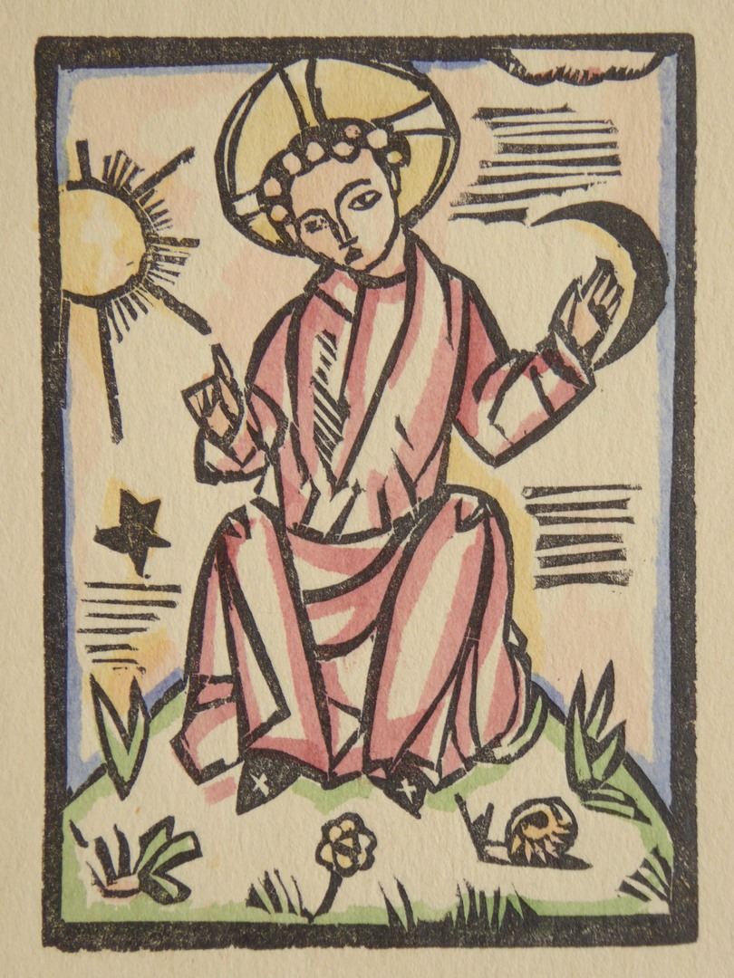 Christus zittend tussen zon en maansikkel, met slak aan Zijn voeten