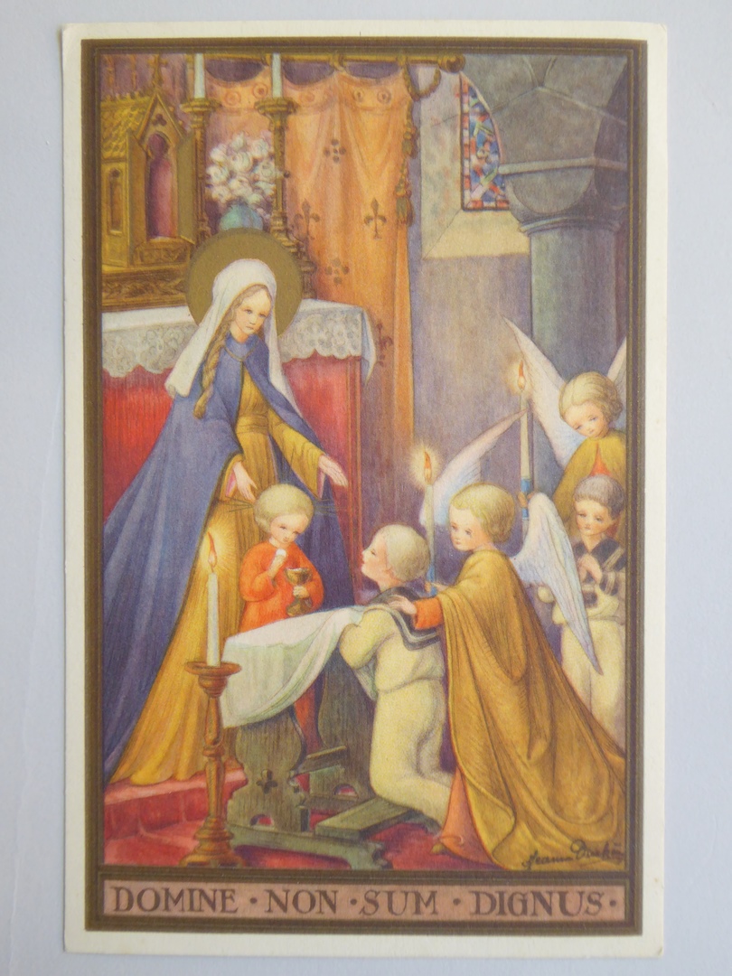 Prentbriefkaart, Eerste Communie, Jezuskind reikt jongetje de communie uit, met "Domine non sum ..."