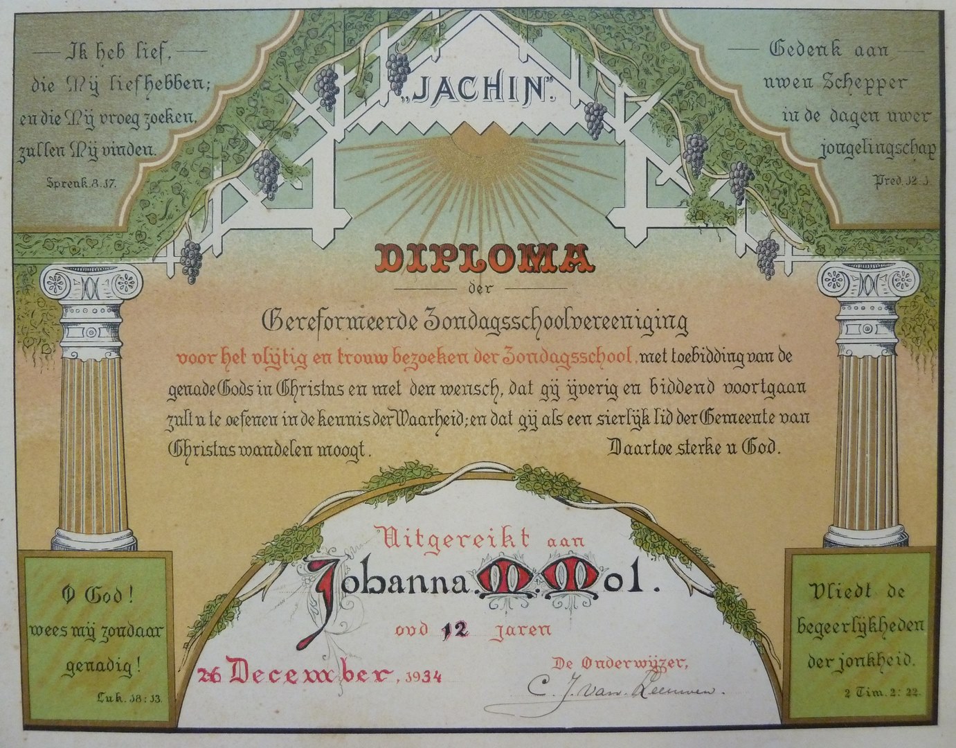 Diploma Gereformeerde Zondagsschoolvereeniging Jachin uitgereikt aan Johanna M. Mol