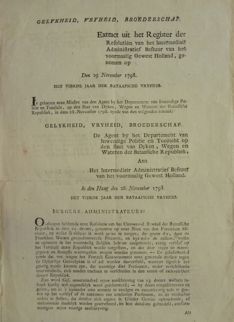 Gelykheid, vryheid, broederschap. Extract uit het register ... Bataafsche Republiek ... waakend oog ... alle die priesters ...