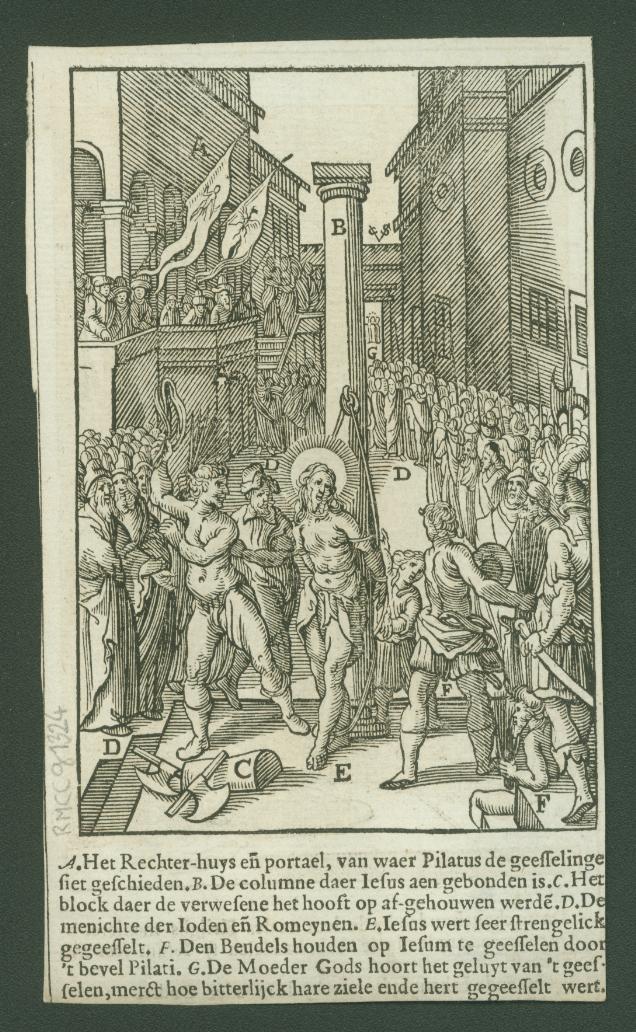 Blad uit boek met bespotting in het huis van Caiphas, kz. geseling van Jezus