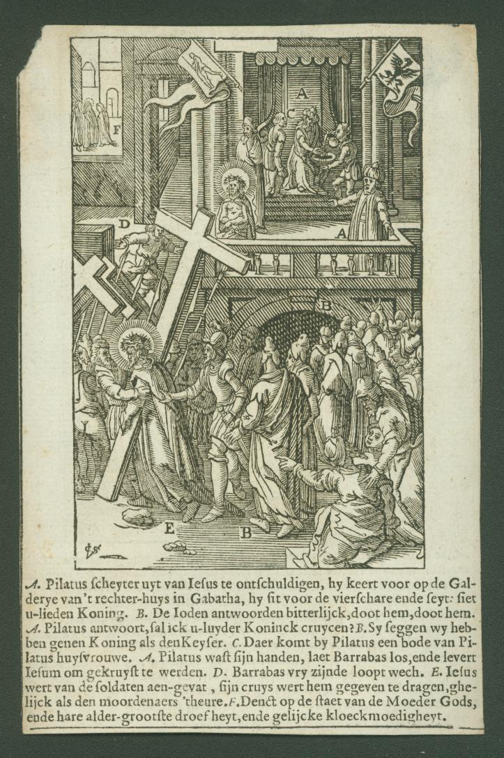 Blad uit boek met Jezus die het kruis opneemt voor het huis van Pilatus, kz. de honderdman doorsteekt met een lans Jezus' zijde