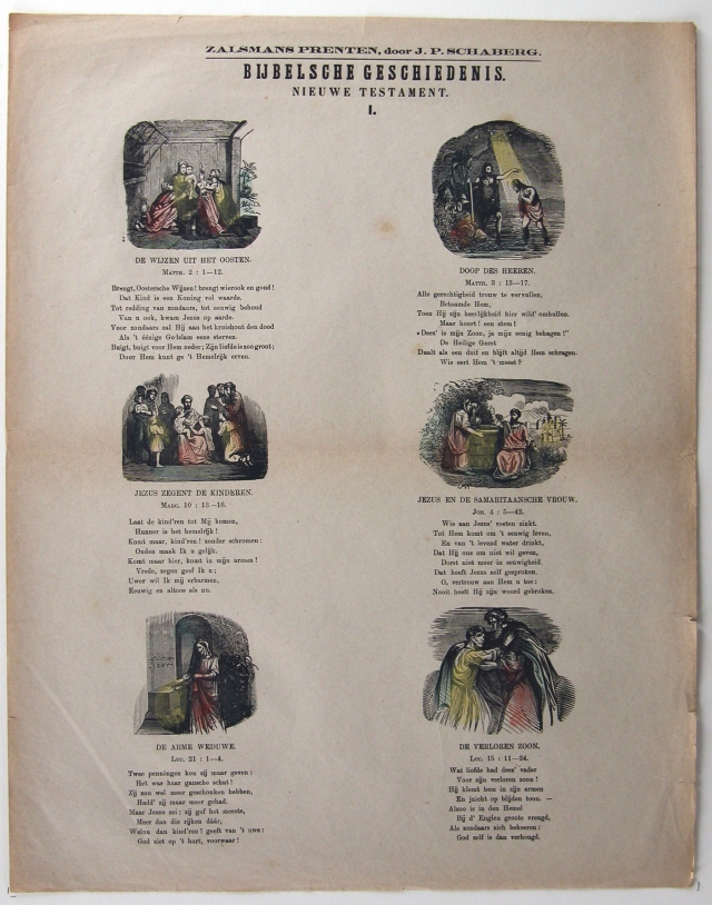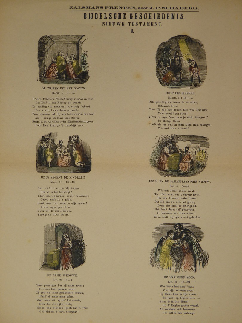 Bijbelsche geschiedenis nieuwe testament I: de wijzen uit het oosten, doop des Heeren, Jezus zegent de kinderen, Jezus en de Samaritaansche vrouw, de arme weduwe, de verloren zoon