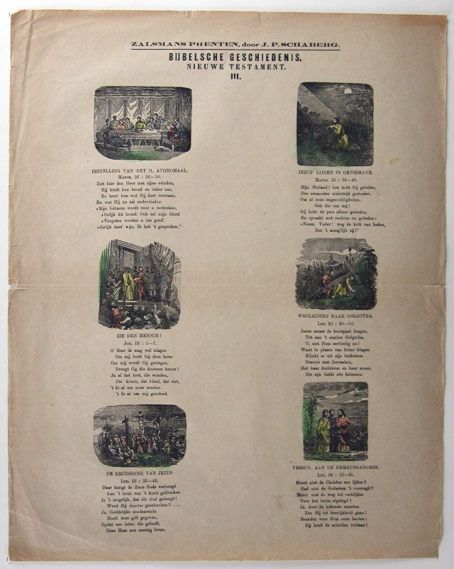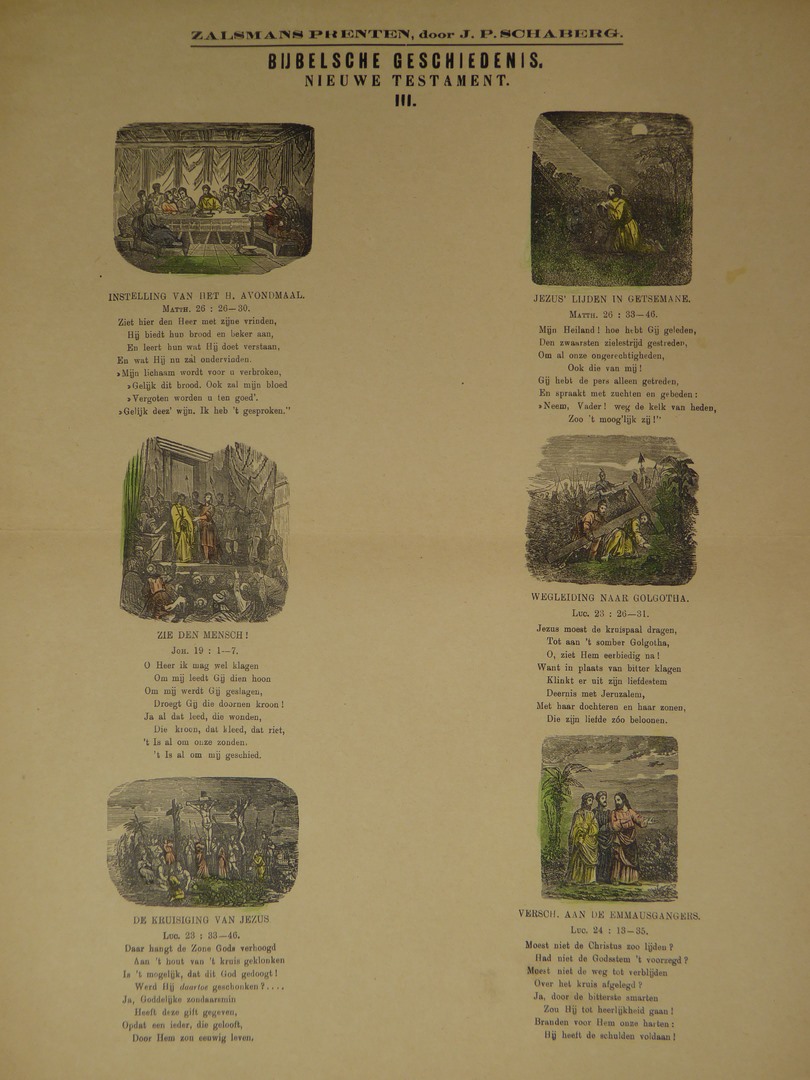 Bijbelsche geschiedenis nieuwe testament III: instelling van het H. Avondmaal, Jezus' lijden in Getsemane, zie den mensch!, wegleiding naar Golgotha, de kruisiging van Jezus, versch. aan de Emmausgangers