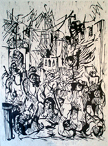 Voor een stuk stadsmuur (rechts) en huizen (links hiervan) die in vlammen opgaan, een menigte plunderaars en naakte vrouwen, op voorgrond lijken.