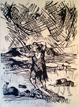 In verlaten landschap met zand- of rotsrug aan de horizon staat Johannes de Doper met het hoofd naar links en linkerarm met gebalde vuist uitgestoken, rechterarm gebogen boven het hoofd, in de lege ruimte te roepen, in dierenvel gekleed.