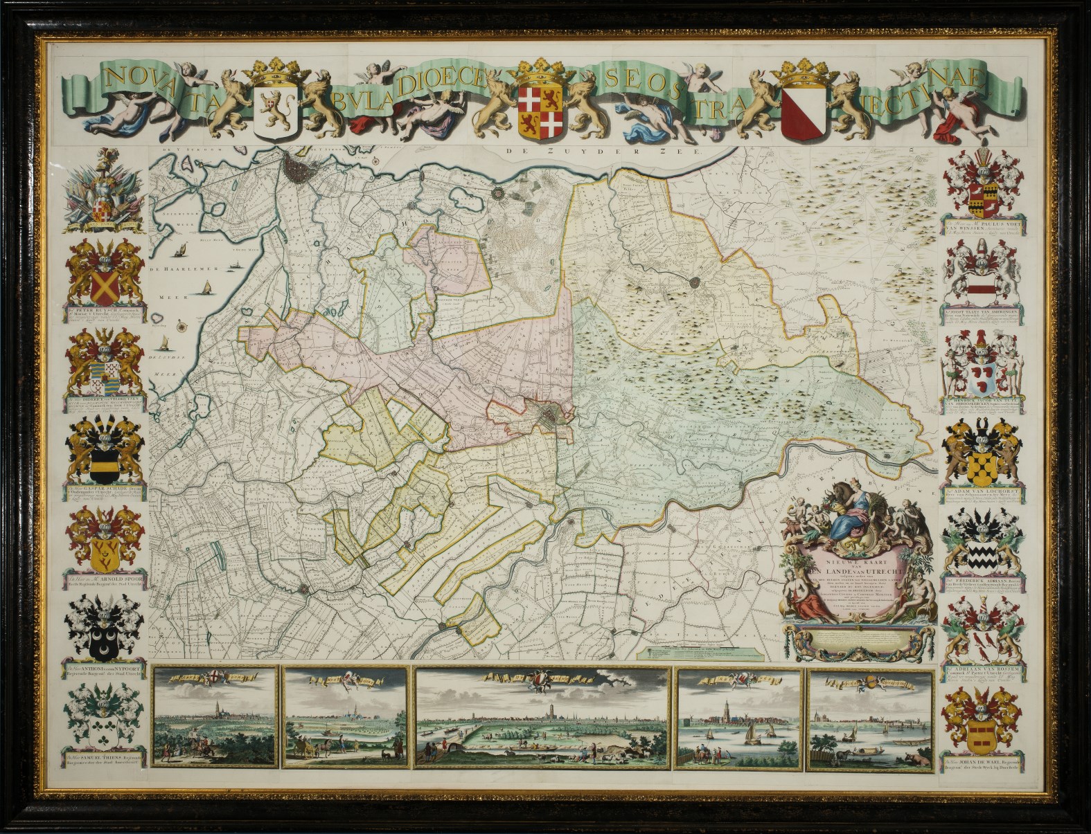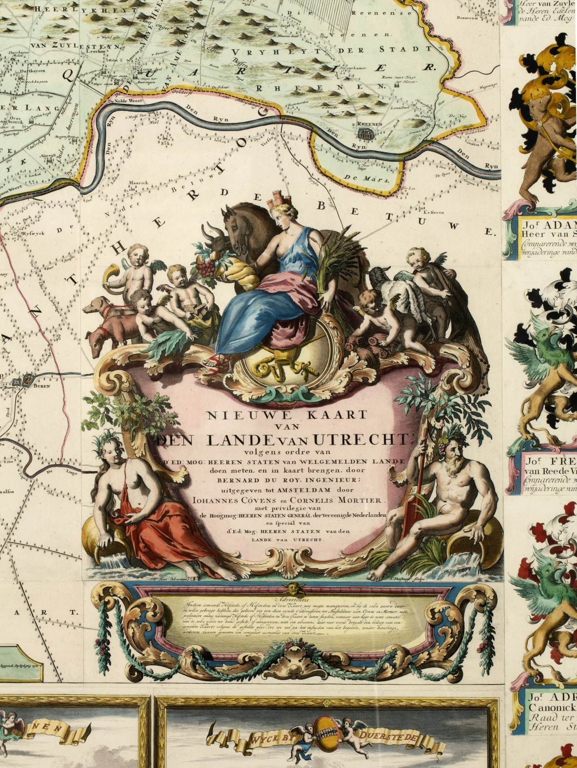 Nieuwe kaart van den Lande van Utrecht volgens ordre van d'Ed. Mog. Heeren Staten van welgemelden lande doen meten en in kaart brengen door Bernard du Roy, ingenieur. Kopergravure op zeventien bladen: handgekleurde kaart van de provincie Utrecht, samengesteld uit de oorspronkelijke elf kaartbladen en omgeven door een rand van andere bladen, bestaande uit de ...