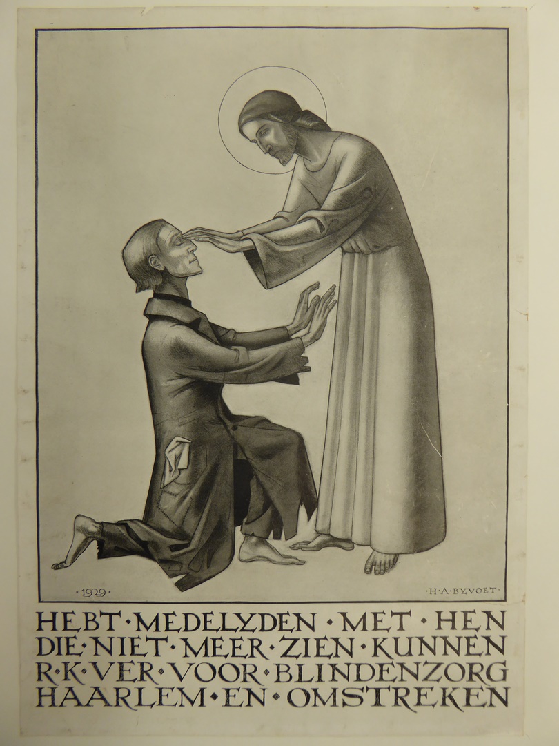 Christus legt de handen op de ogen van een geknielde blinde