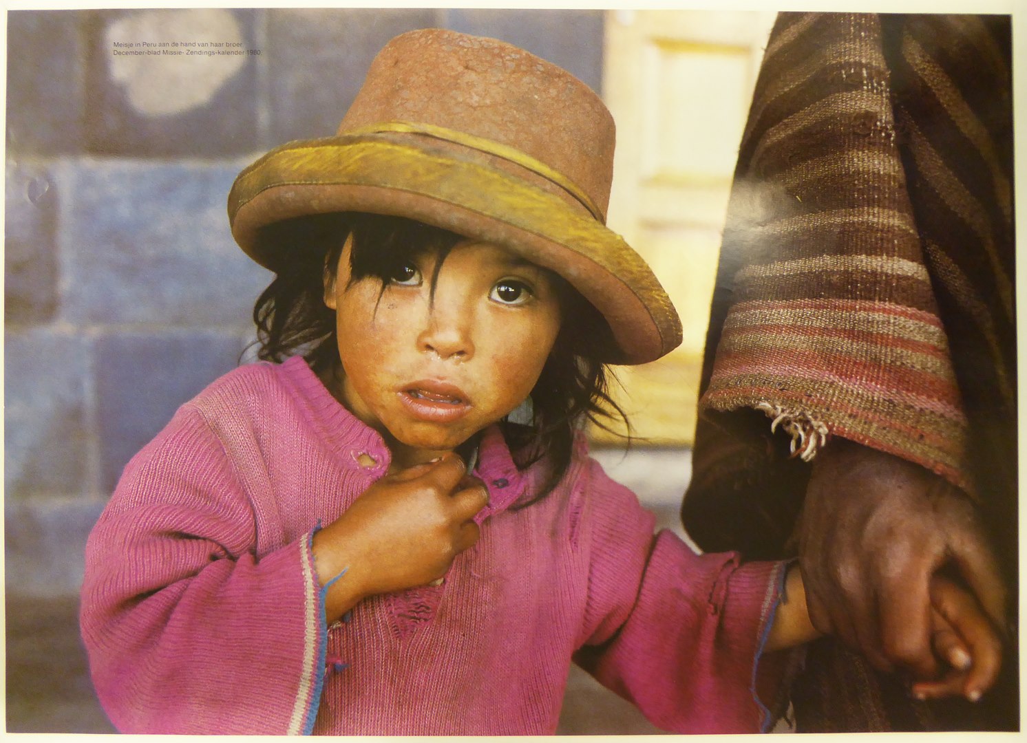 Affiche "Meisje in Peru, aan de hand van haar broer" decemberblad van missie-zendingskalender