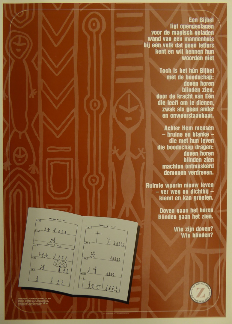 Affiche magische voorstellingen op een bergwand in Irian Jaja met bijbelpagina's