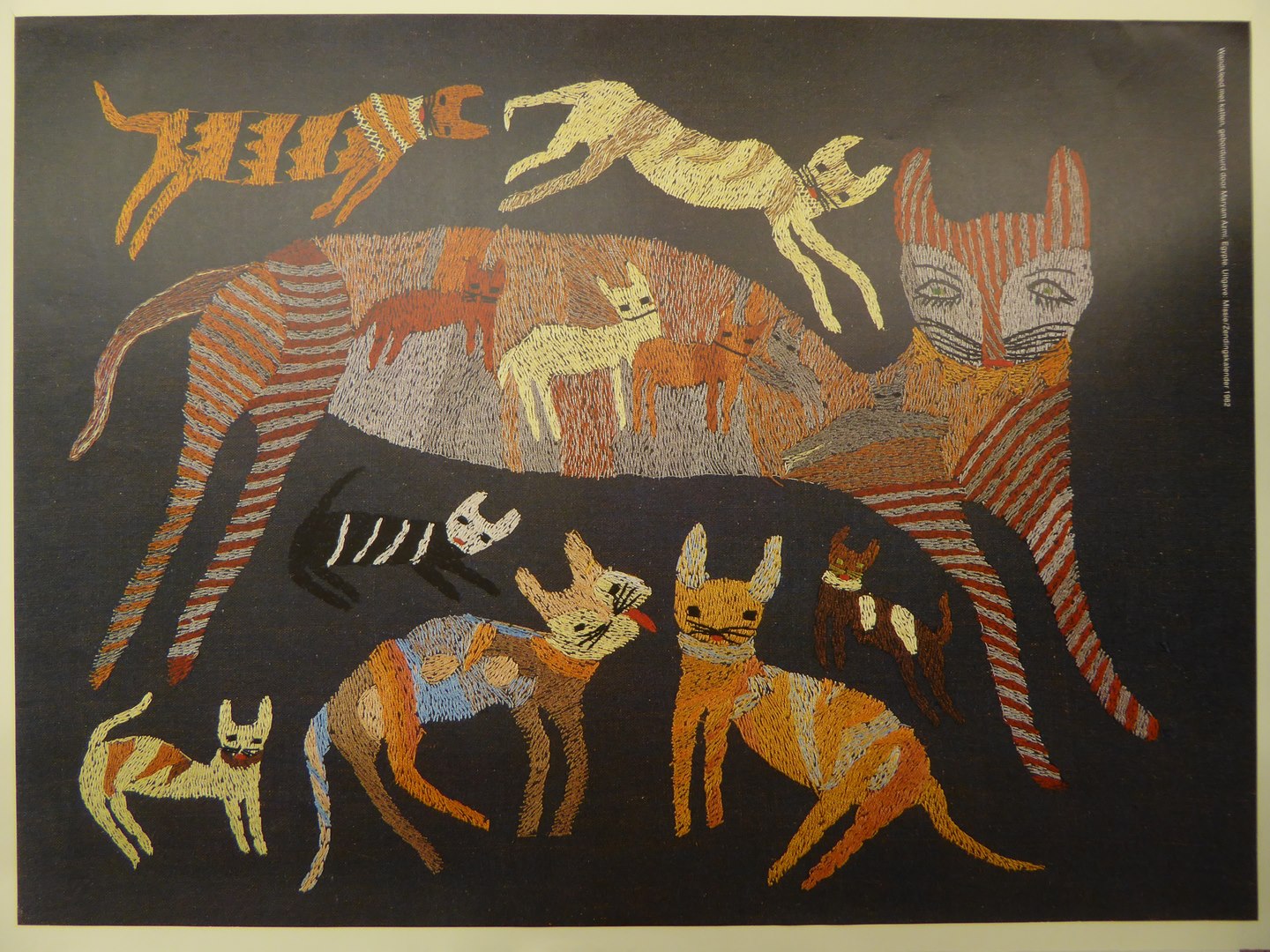 Affiche van wandkleed met geborduurde katten in verschillende kleuren op een donkere achtergrond