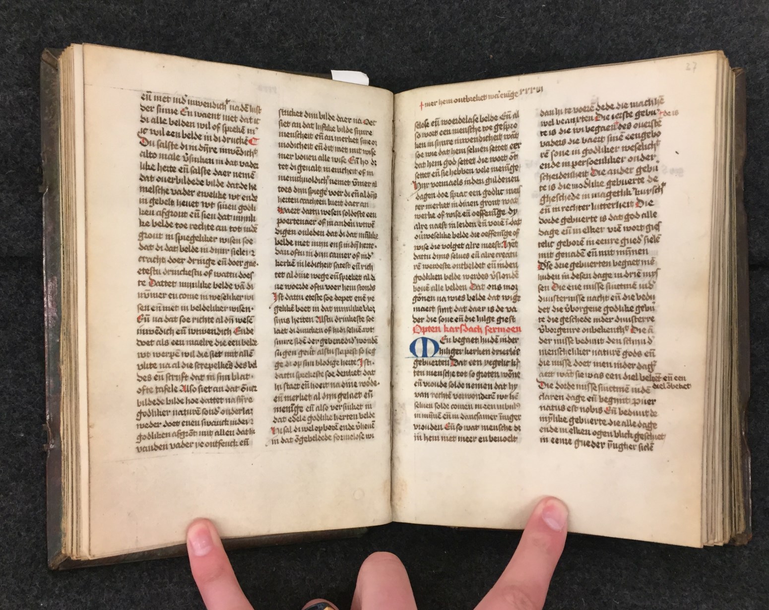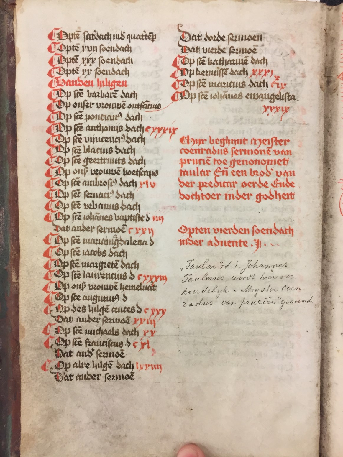 Het handschrift van Museum Catharijneconvent stamt uit het midden van de 15e eeuw. Voorin staat een lijst van bijna honderd sermoenen, beginnend met een preek voor de derde zondag van de advent, gevolgd door een lange serie voor het Tijdeigen, met daarna nog een lijst van tweendertig preken voor feesten van verschillende heiligen. Deze sermoenen ...
