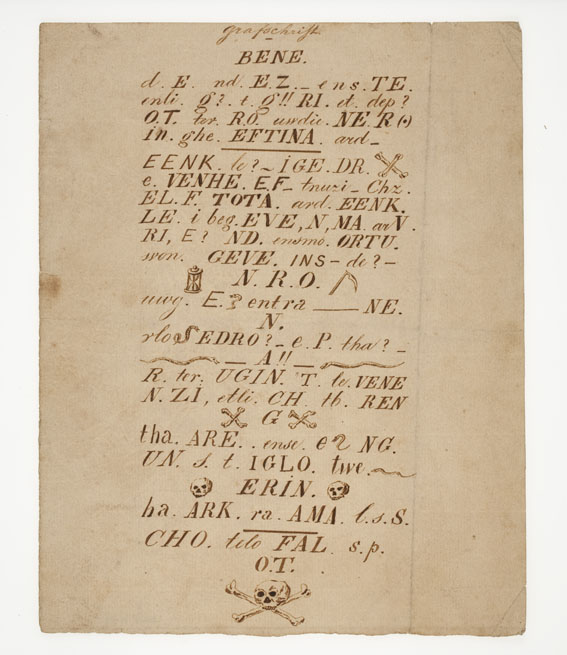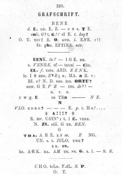 Gedicht, met geheimschrift "Beneden deze steen ligt Griet de Pottevrouw ..."