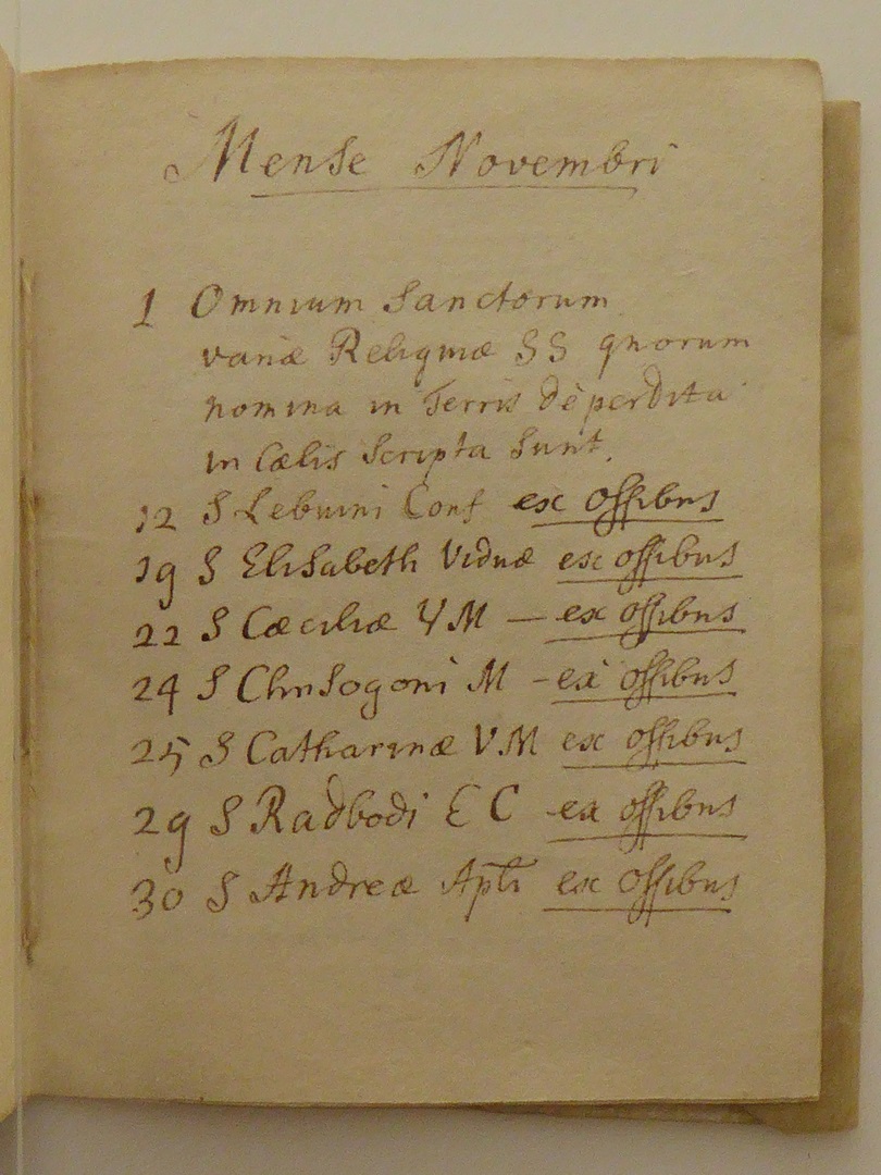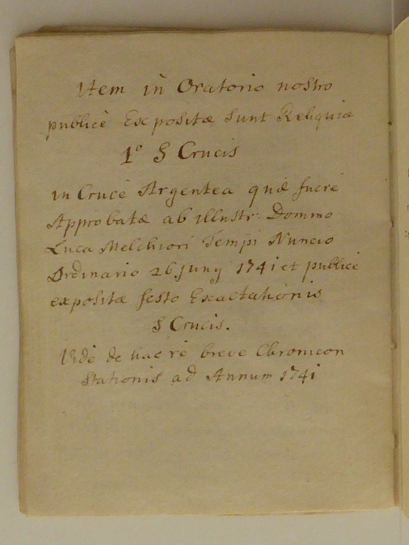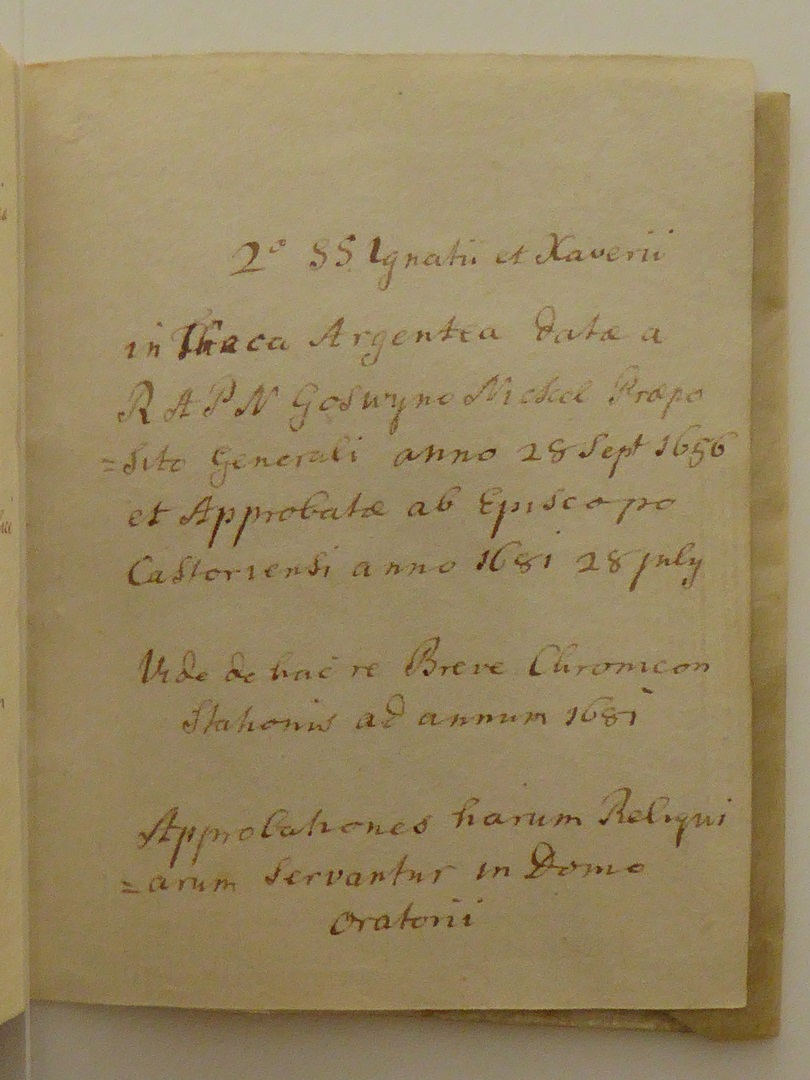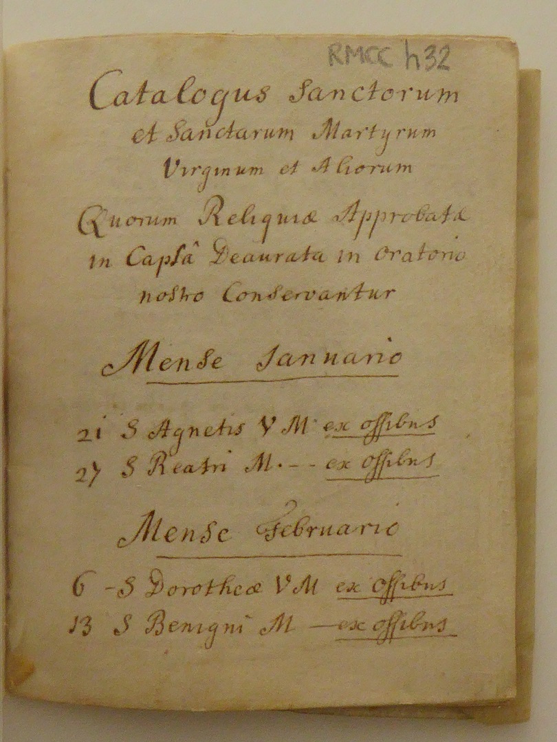 Reliekinventaris van de O.L.V. ten Hemelopnemingkerk te Zwolle. Perkamenten omslag met handschrift in inkt in het Latijn. De opsomming van de relieken is in volgorde opgesteld volgens de heiligenkalender. Na de kalender volgen enkele opmerkingen over onder andere bisschoppelijke authenticiteitscontroles in 1672 en 1754: 1. kruis (in cruce...), 2. Ignatius en Xaverius (in theca...). Op ...