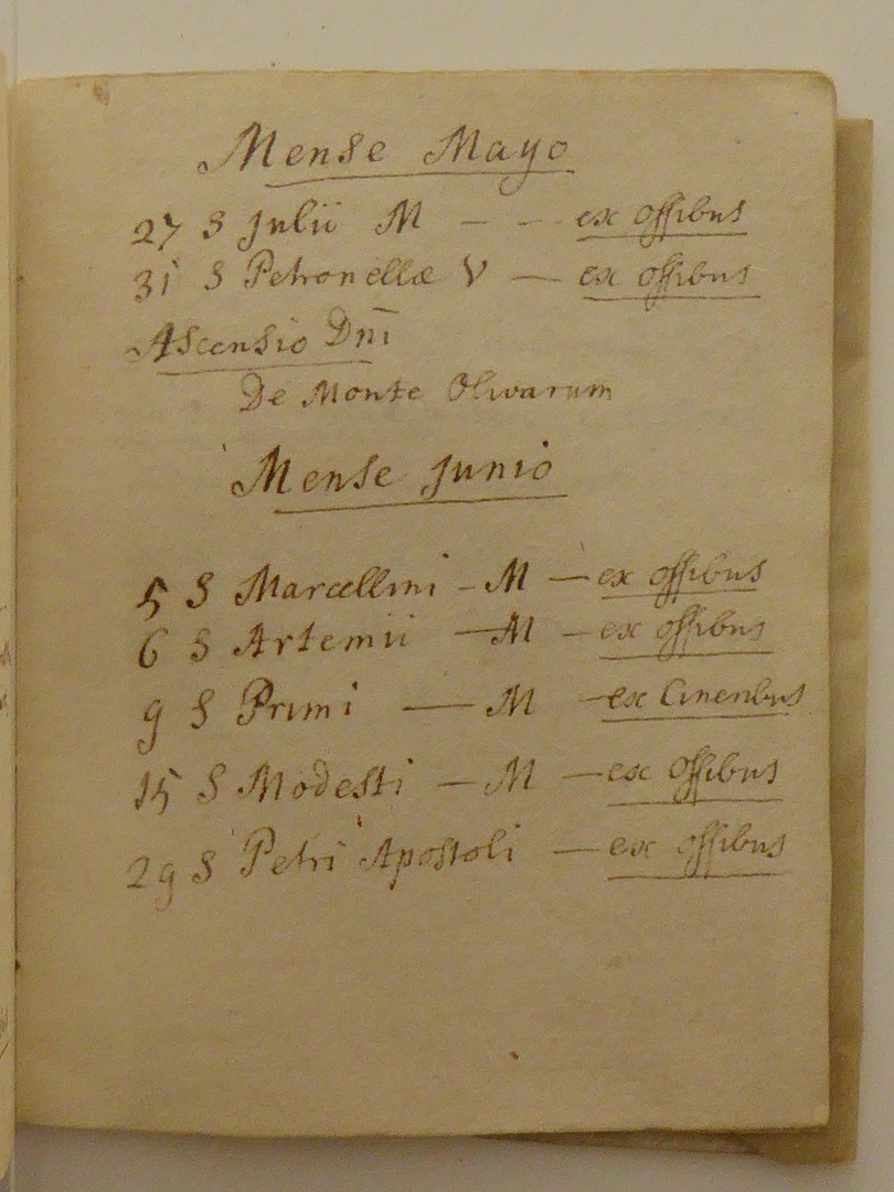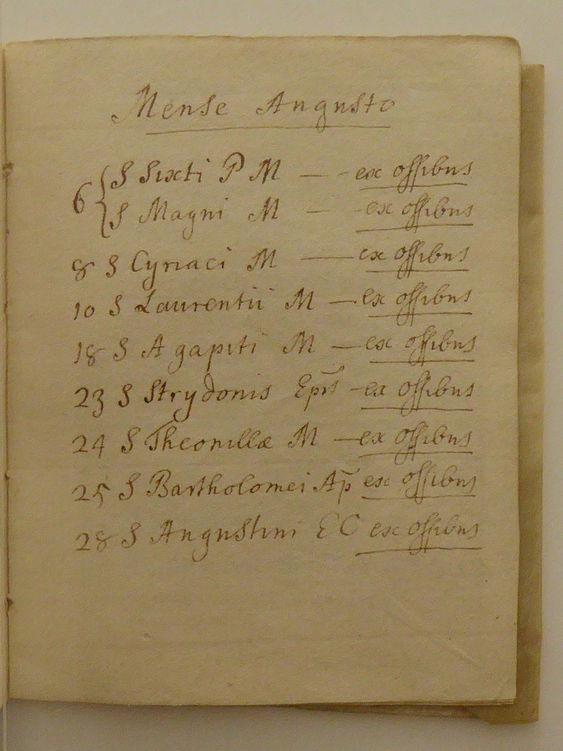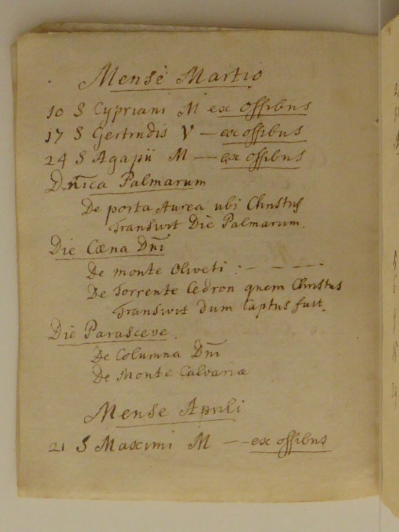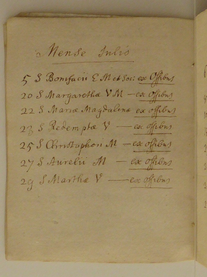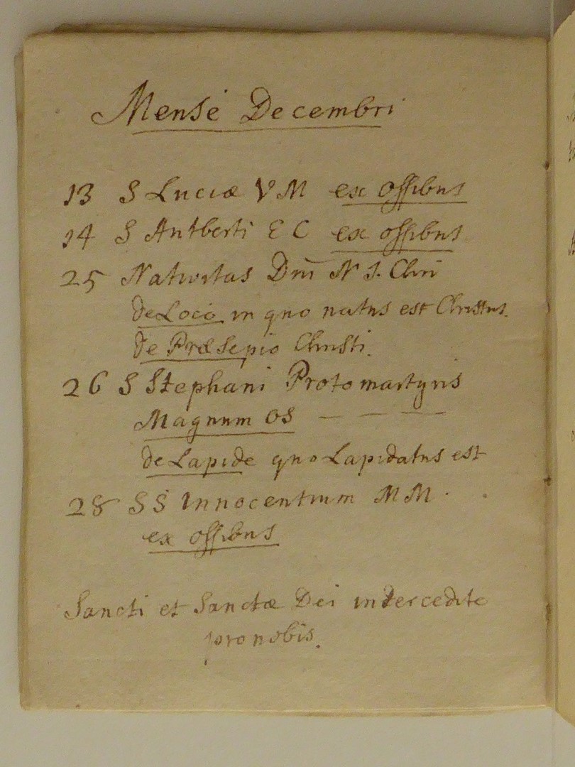 Reliekinventaris van de O.L.V. ten Hemelopnemingkerk te Zwolle. Perkamenten omslag met handschrift in inkt in het Latijn. De opsomming van de relieken is in volgorde opgesteld volgens de heiligenkalender. Na de kalender volgen enkele opmerkingen over onder andere bisschoppelijke authenticiteitscontroles in 1672 en 1754: 1. kruis (in cruce...), 2. Ignatius en Xaverius (in theca...). Op ...