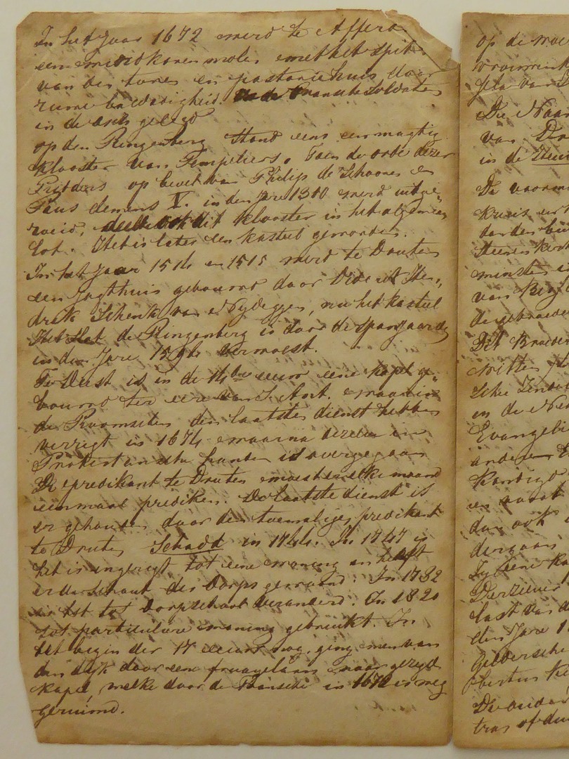 Handschrift over kerkgeschiedenis van het Land van Maas en Waal. Genoemde plaatsen o.a.: Nijmegen, Ringenberg, Druten.