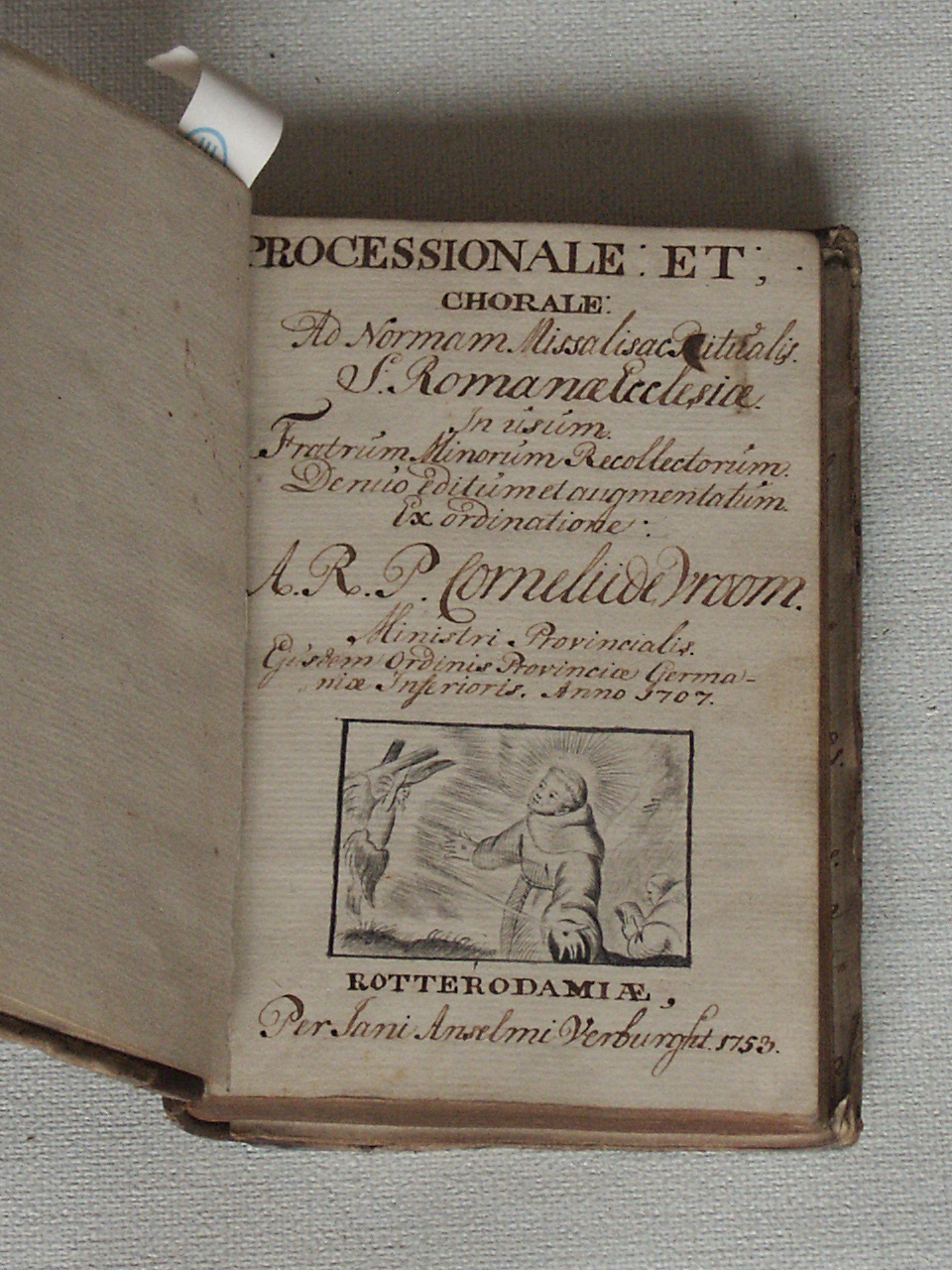 Processionale et chorale ad normam missalis et ritualis S. Romanae ecclesiae in usum fratrum minorum recollectorum. denuo, editum et augmentatum. Ex ordinatione a.r.p. Cornelii de Vroom, ministri provincialis, ejusdem ordinis provincia Germaniae Inferiori, anno 1707.