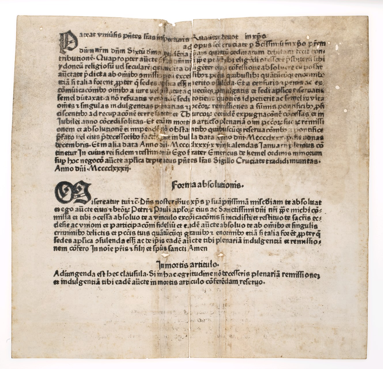 Aflaatbrief van paus Sixtus IV, Litterae indulgentiarum pro tuitione fidei contra Turcos [RMCC i22]. De tekst begint met: "Pateat universis presentes litteras inspecturis .../... Sixtum ... quartum ... In cuius rei fidem et testimonium ego frater Emericus de kemel ordinis minorum / ... presentes litteras sigillo Cruciate tradidi munitas. / Anno domini Mcccclxxxij. (afkortingen opgelost). ...